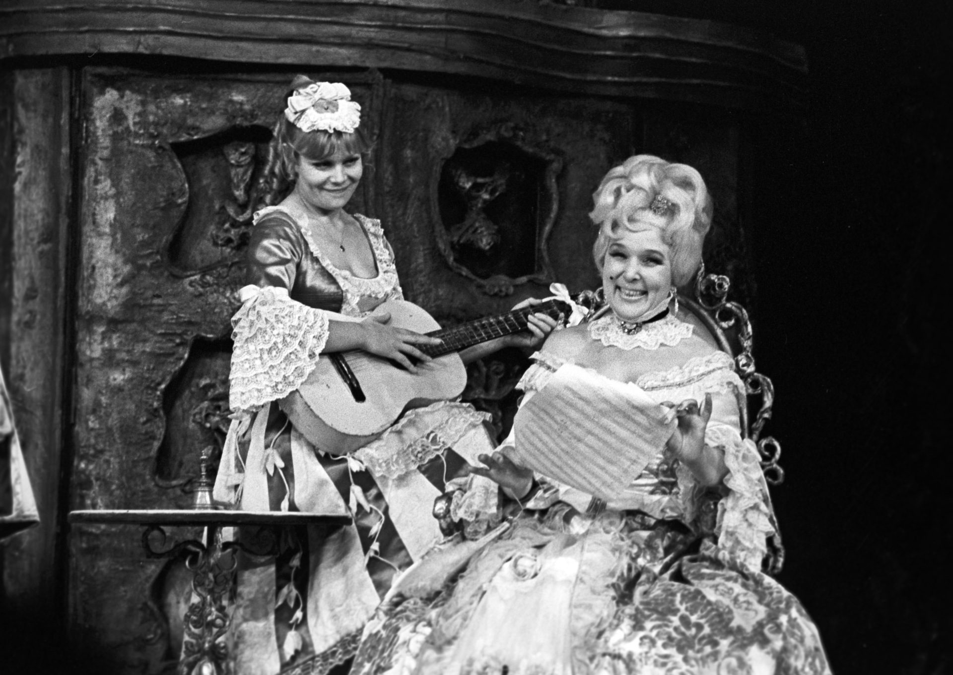 В Театре сатиры Васильева работала до последних дней. За 75 лет творческой деятельности она воплотила более 60 сценических образов. К числу наиболее заметных работ относится роль графини Альмавивы в спектакле «Безумный день, или Женитьба Фигаро» 1968 года / Нина Корниенко и Вера Васильева в сцене из постановки «Безумный день или женитьба Фигаро» / Виталий Арутюнов / РИА Новости