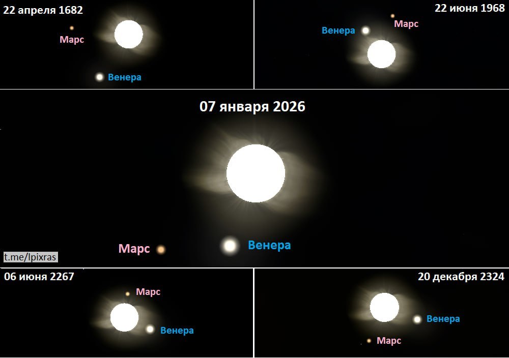 • Декабрь 2025 — январь 2026: Венера и Марс постепенно приближаются к Солнцу, сокращая расстояние между собой до 2-3° к новогодним праздникам.